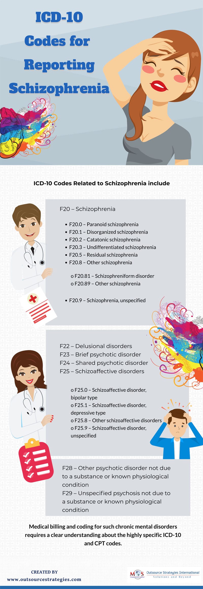 Schizophrenia is a severe mental disorder in which people interpret reality abnormally. Based on the psychiatrist’s documentation, this condition can be reported using the right ICD-10 codes. Healthcare providers can benefit from medical coding outsourcing solutions to save time and effort, and submit accurate claims for optimal reimbursement.